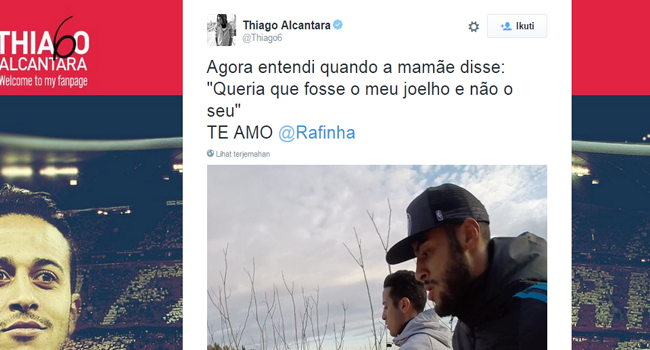 Mantan gelandang Barcelona yang kini bermain di Bayern Munchen tersebut menulis, "Sekarang aku mengerti kenapa ibu pernah berkata, 'saya harap itu lutut saya, bukan lututnya'," tulis Thiago dalam akun @Thiago6.