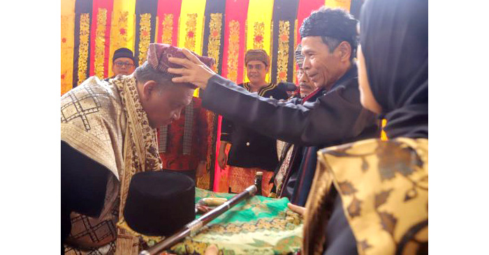 KEHORMATAN: Sekjen PBB Afriansyah Noor menerima gelar adat Datuak Rajo Basa, Kamis (27/4).