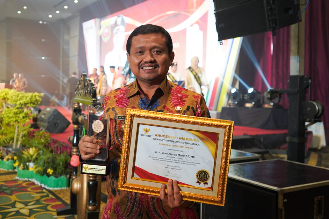 JawaPos.com - Bupati Sumedang Dony Ahmad Munir meraih Juara Pertama Anugerah Keterbukaan Informasi Publik (Tinarbuka) 2023 Kategori Bupati yang digelar oleh Komisi Informasi (KI) Pusat. Penghargaan tersebut merupakan penghargaan ke-119 yang diraih oleh Pemerintah Daerah Kabupaten Sumedang di masa kepemimpinan Bupati Dony Ahmad Munir dan Wakil Bupati Erwan Setiawan.