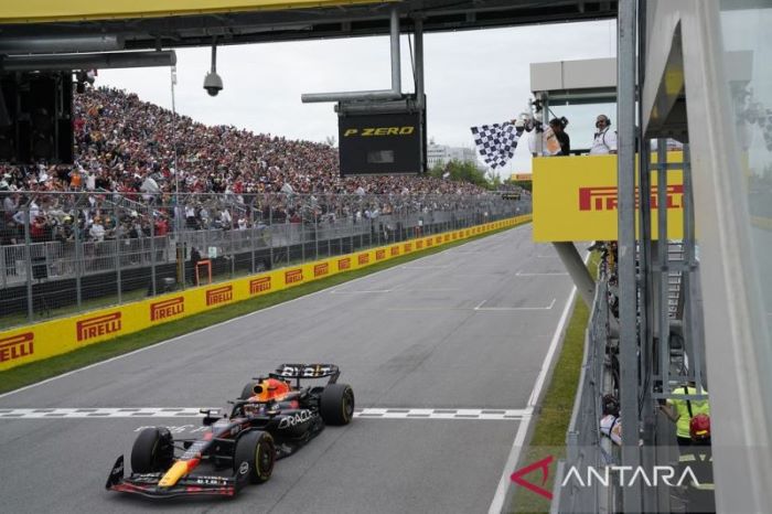 JawaPos.com–Pembalap Red Bull Max Verstappen berhasil finish pertama dalam Formula 1 (F1) Grand Prix (GP) Kanada 2023 di Sirkuit Gilles Villeneuve, Montreal, Senin (19/6) dini hari WIB. Verstappen mencatatkan waktu 1.33.58.348 selama balapan yang berlangsung 70 putaran tersebut.