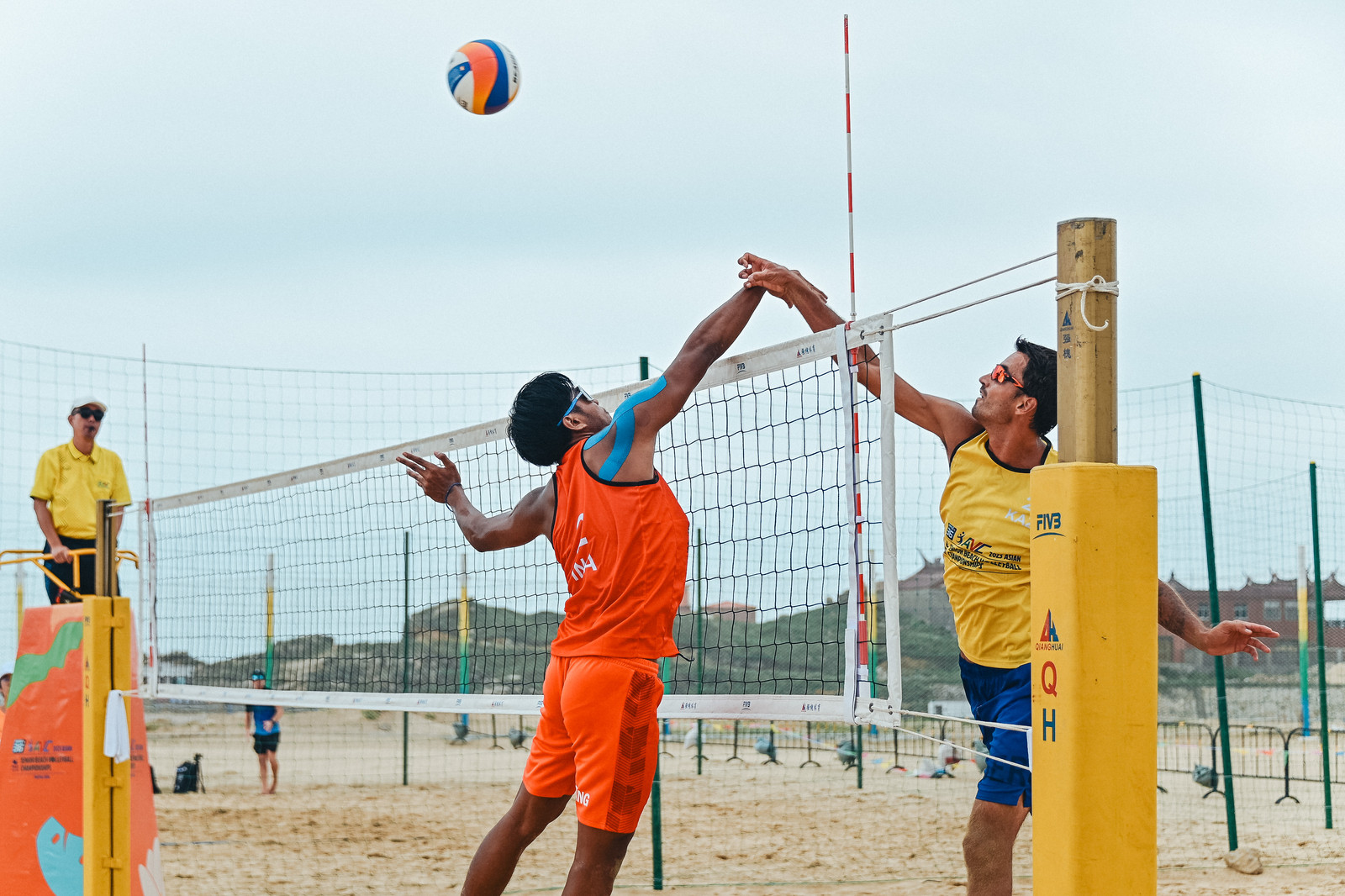 Bintang Akbar (kiri) ketika menghadapi Kazakhstan di Kejuaraan Asia Voli Pantai Senior (Asian Senior Beach Championship), di Pingtan, Tiongkok, Jumat (23/6).