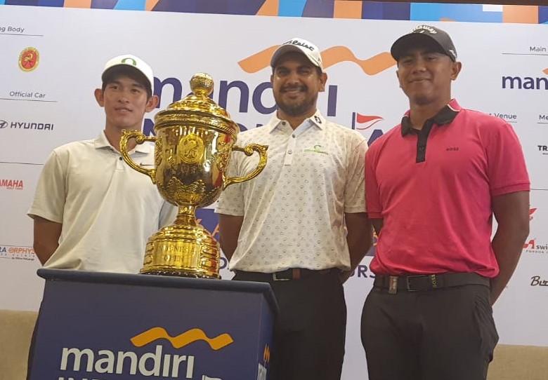 Dari kiri Gabriel Hansen Hari, Gaganjeet Bhular, Naarajie E. Ramadhanputra saat preskon di Pondok Indah Golf Course, Jakarta, Selasa (1/8).