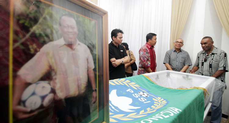Menpora Imam Nahrawi (kiri kedua), didampingi adik Sinyo, Lauren Aliandoe (kanan kedua), anak bungsu Sinyo, Theodurus Aliandoe (kiri) dan Mantan Pemain Bola Yohanes Auri (kanan) mendatangai Rumah Duka Mantan pemain dan pelatih tim nasional sepak bola Indo