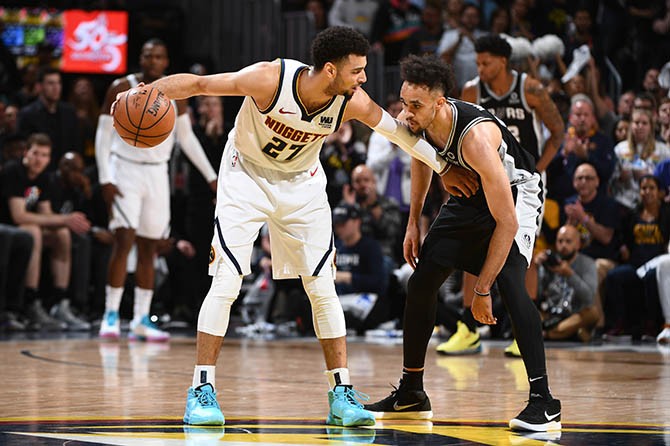 DENVER, CO - APRIL 16: Jamal Murray #27 of the Denver Nuggets handles the ball against Derrick White #4 of the San Antonio Spurs during Game Two of Round One of the 2019 NBA Playoffs on on April 16, 2019 at the Pepsi Center in Denver, Colorado. NOTE TO US