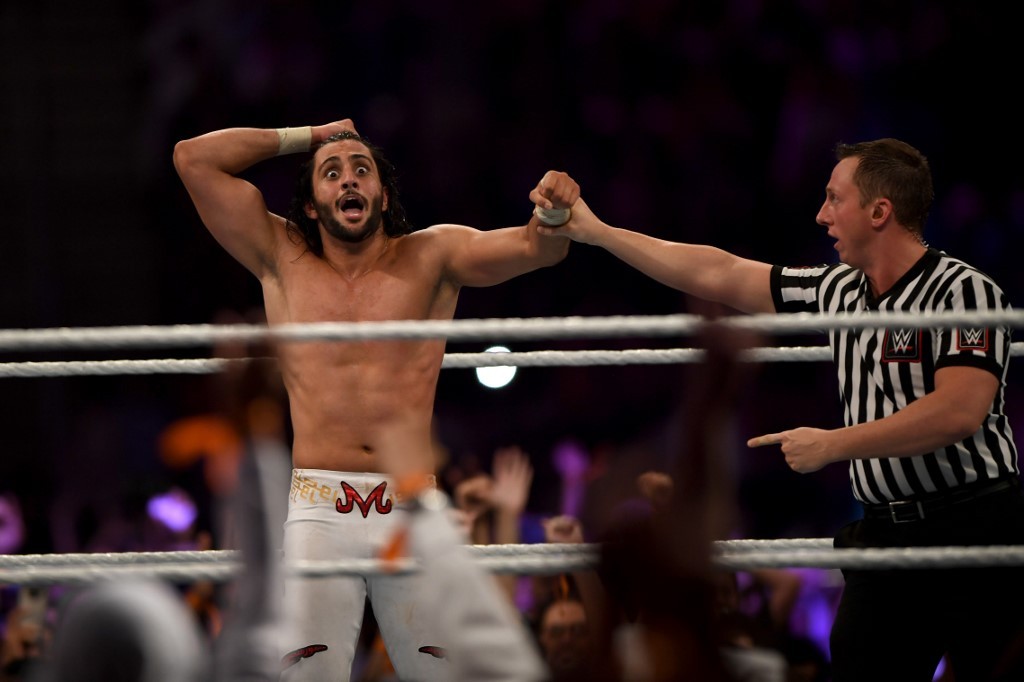 Saudi wrestler Mansoor al-Shehail (L) reacts on the ring during the World Wrestling Entertainment (WWE) Super Showdown event in the Saudi Red Sea port city of Jeddah late on January 7, 2019. (Photo by Amer HILABI / AFP)