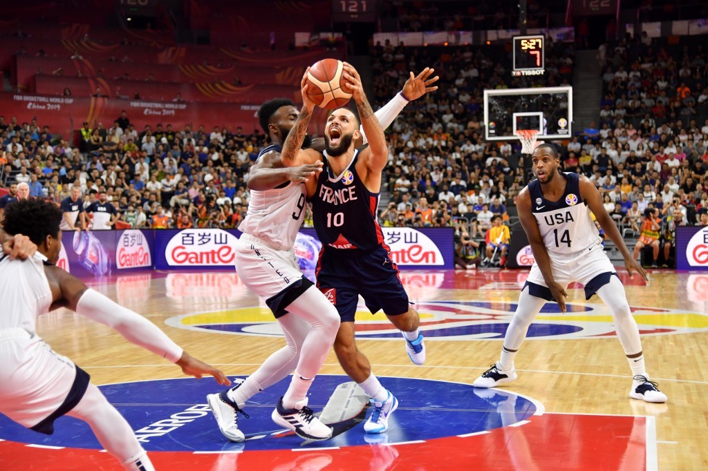 DONGGUAN, CHINA - SEPTEMBER 11: Evan Fournier #10 of France goes to the basket against USA during the 2019 FIBA World Cup Quarter-Finals on September 11, 2019 at the Dongguan Basketball Center in Dongguan, China. NOTE TO USER: User expressly acknowledges