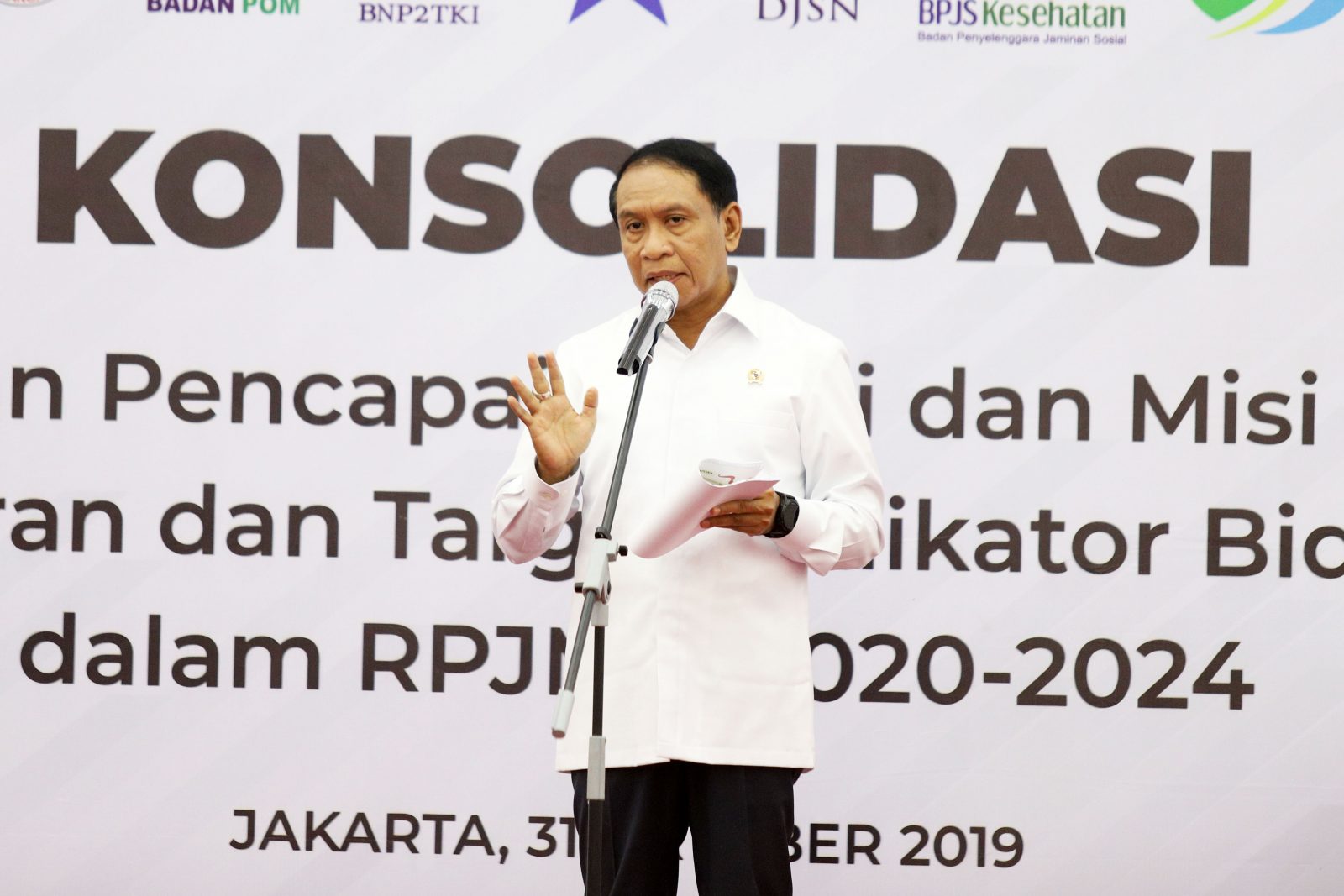 Menteri Pemuda dan Olahraga Zainudin Amali saat pertemuan konsolidasi dengan tujuh menteri dan sembilan kepala lembaga di bawah lingkup koordinasi Kemenko PMK, Jakarta, Kamis (31/10/2019). Adapun konsolidasi tersebut membahas percepatan pencapaian visi