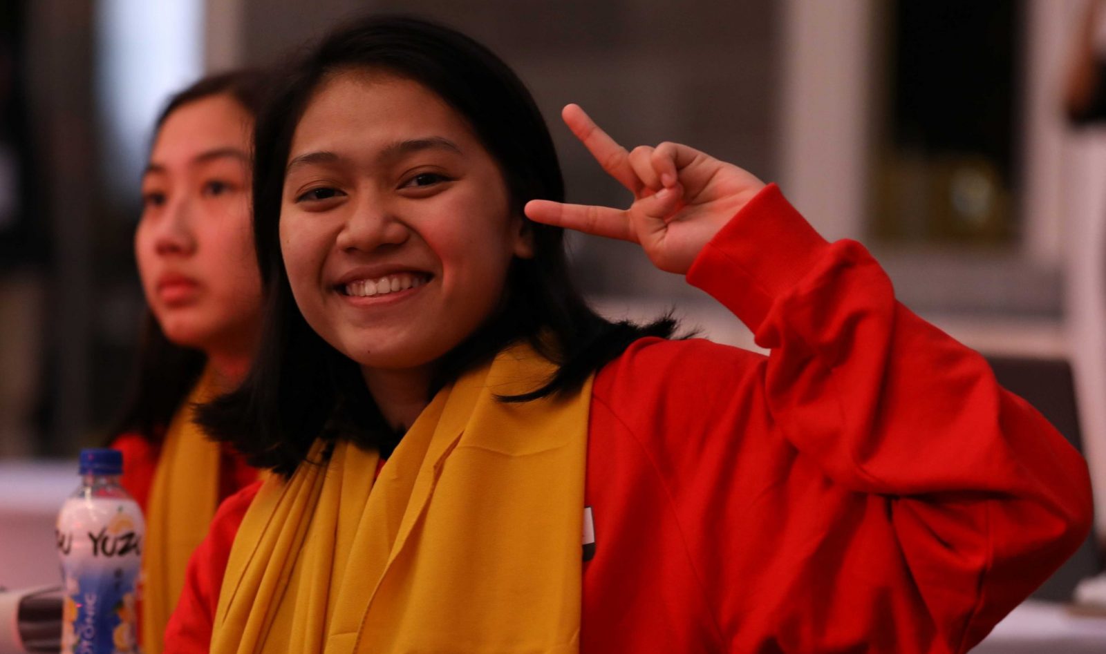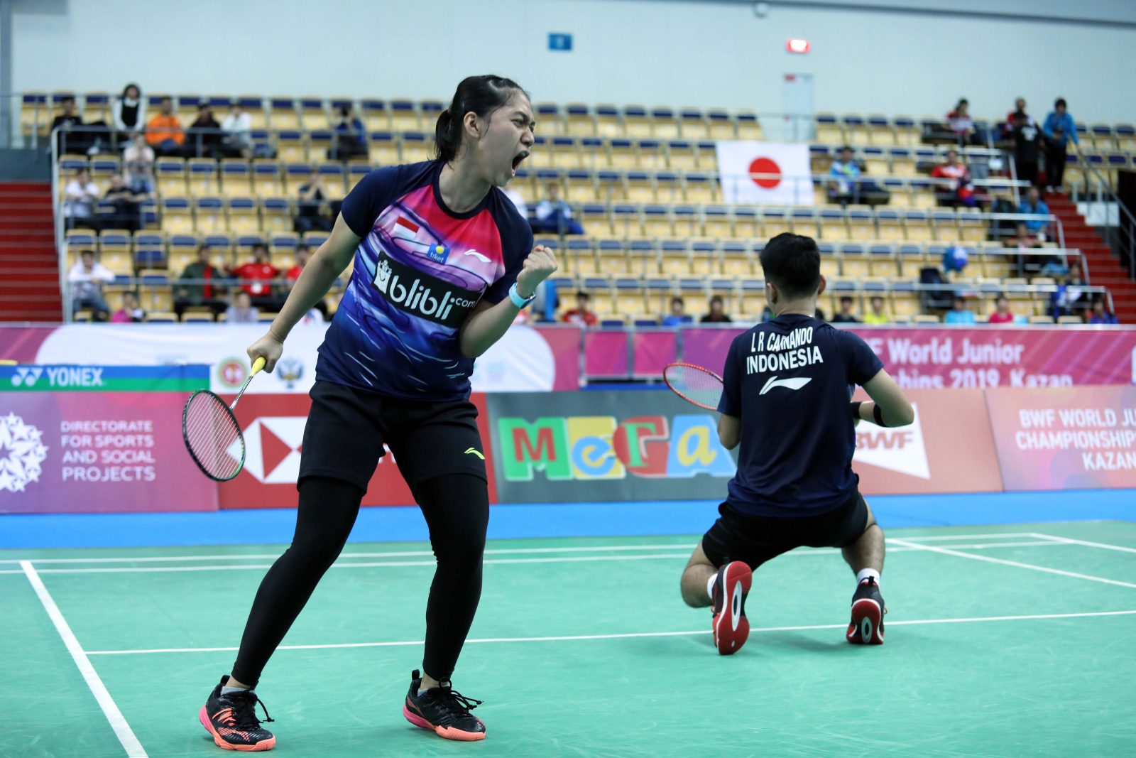 Leo Rolly Carnando/Indah Cahya Sari Jamil merayakan keberhasilan mereka lolos ke final Kejuaraan Dunia Junior 2019. (Widya Amelia/PP PBSI).