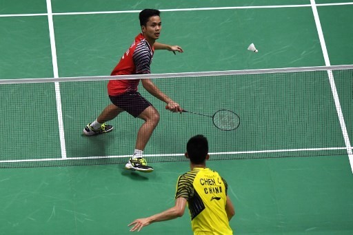 Anthony Sinisuka Ginting of Indonesia hits a return against Chen Long of China during their men