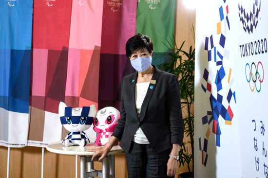 This picture taken on June 12, 2020 shows Tokyo governor Yuriko Koike, seen wearing a face mask, posing for a photo with Miraitowa (L) and Someity (C), respective mascots for the Tokyo 2020 Olympic and Paralympic Games, before an interview with AFP at the