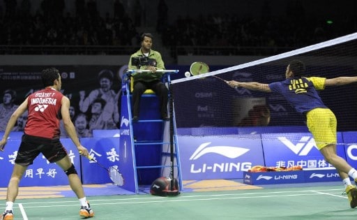 Lin Dan melawan Taufik Hidayat pada ajang BWF World Superseries Finals di Liuzhou, Guangxi, 5 Desember 2011. (Liu Jin/AFP)