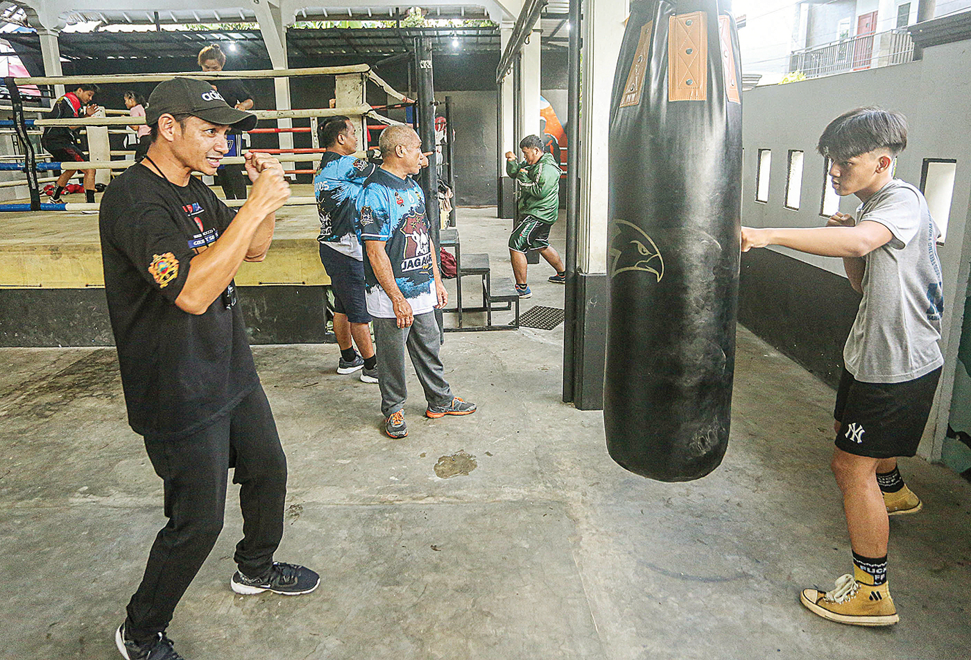 BURU PRESTASI: Anak-anak muda belatih tinju di Sasana Tinju Richard Engkeng, Jakarta, Kamis (30/3/2023). Latihan tersebut diprakarsai Polsek Jagakarsa.