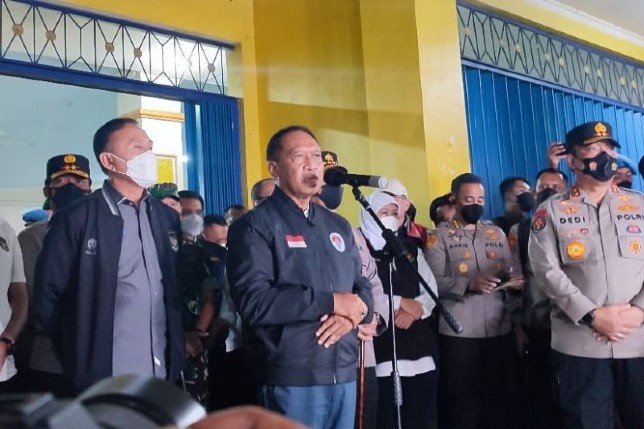 Menpora Zainudin Amali (tengah) saat menyampaikan perkembangan di Stadion Kanjuruhan, Malang, Minggu (2/10). Willy Irawan/Antara