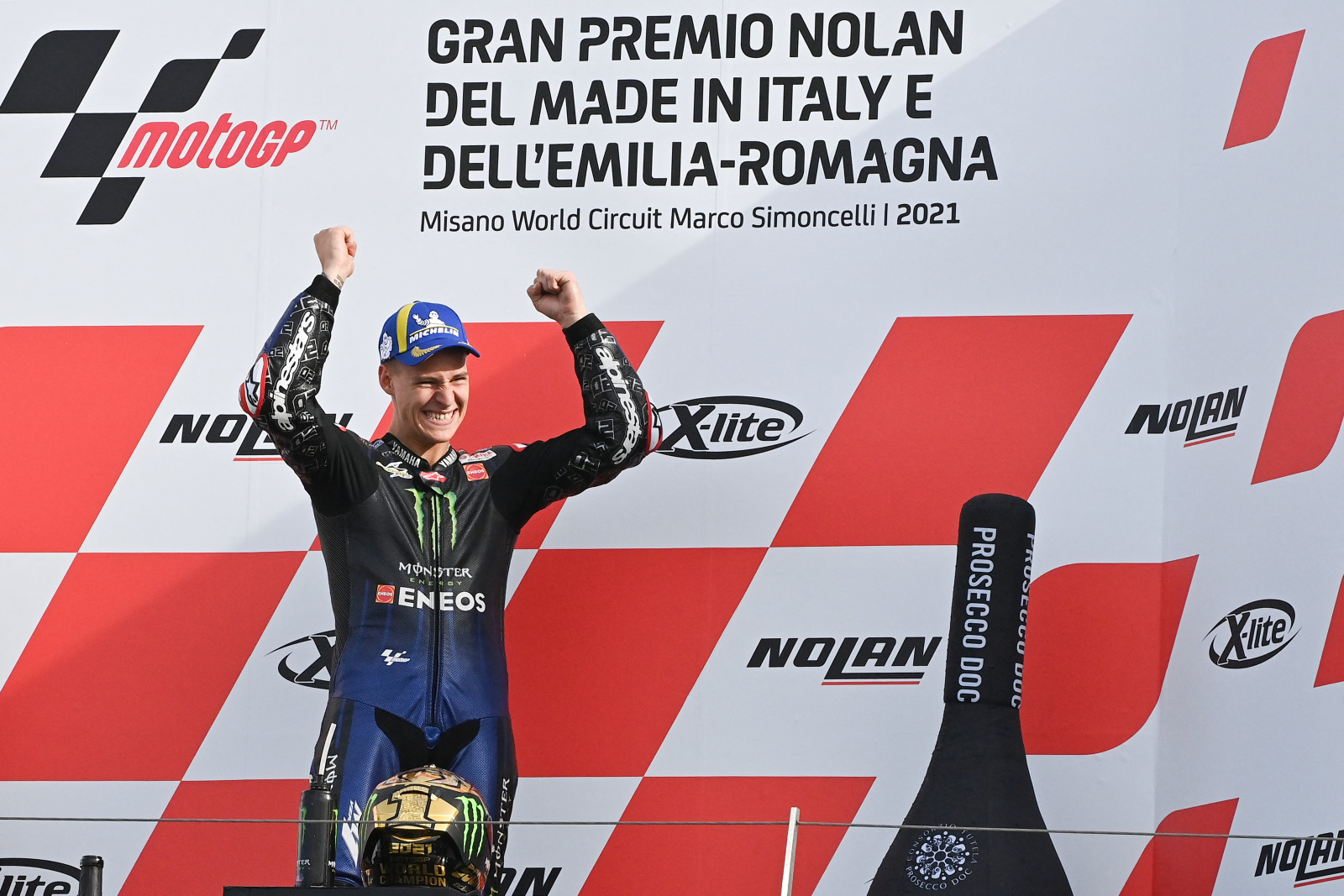 Yamaha French rider Fabio Quartararo celebrates his world champion title on the podium on October 24, 2021 after the Emilia-Romagna MotoGP Grand Prix at the Misano World Circuit Marco-Simoncelli in Misano Adriatico, Italy. ANDREAS SOLARO / AFP