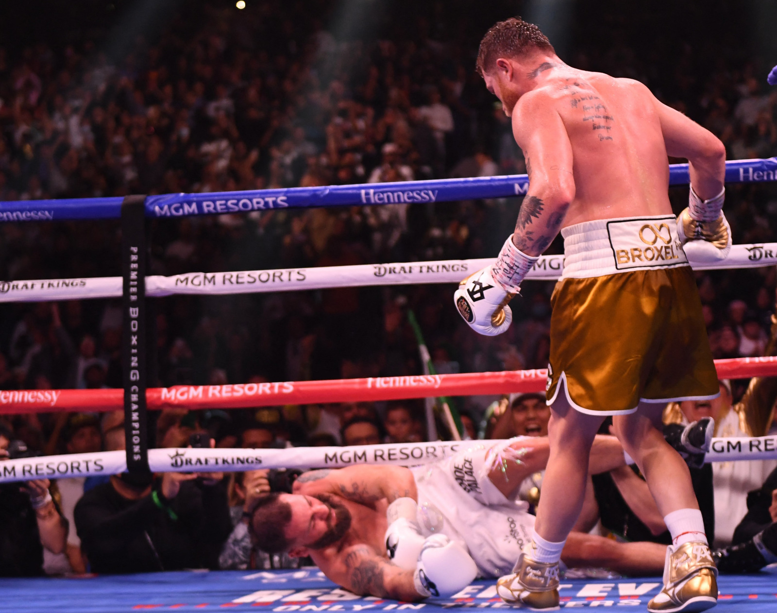 Canelo Alvarez of Mexico (R) stands above Caleb Plant of the United States (L) during their super-middleweight unification boxing match at MGM Garden Arena in Las Vegas, Nevada on November 6, 2021. Patrick T. FALLON / AFP