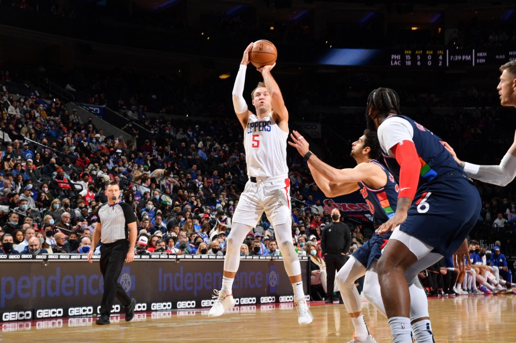 PHILADELPHIA, PA - JANUARY 21: Luke Kennard #5 of the LA Clippers shoots the ball against the Philadelphia 76ers on January 21, 2022 at Wells Fargo Center in Philadelphia, Pennsylvania. NOTE TO USER: User expressly acknowledges and agrees that, by downloa
