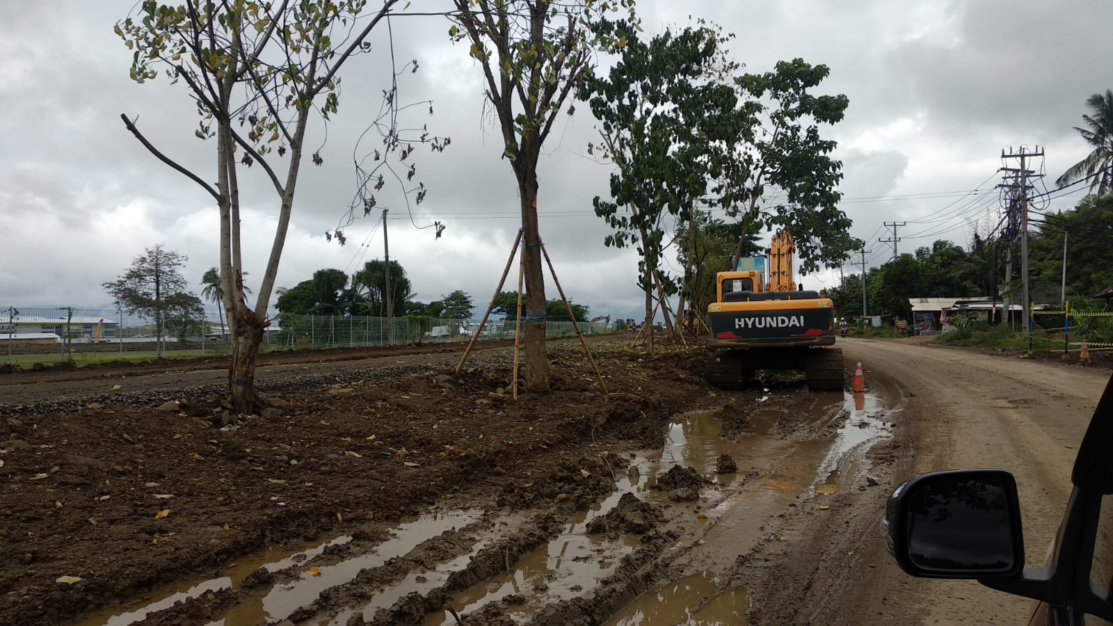 Sepanjang jalan, pohon-pohon yang menghiasi separator terlihat baru ditanam. Di kiri-kanan jalan, puluhan pekerja menanami bahu jalan dengan rumput. Bisa jadi, sebulan lagi baru terlihat hijaunya.
