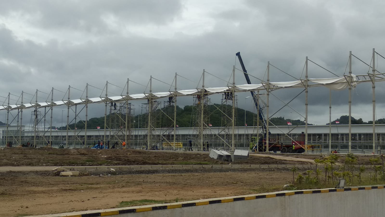 Infrastruktur lain yang sedang dikebut adalah pembangunan grandstand. Jawa Pos menyaksikan langsung pemancangan tiang-tiang grandstand itu karena letaknya memang berseberangan langsung dengan media center.