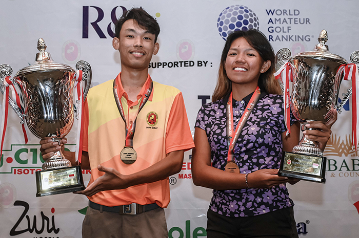 Randy Arbenata Mohamad Bintang dan Kristina Natalia Yoko dengan piala Kejurnas Golf Amatir yang didapat.