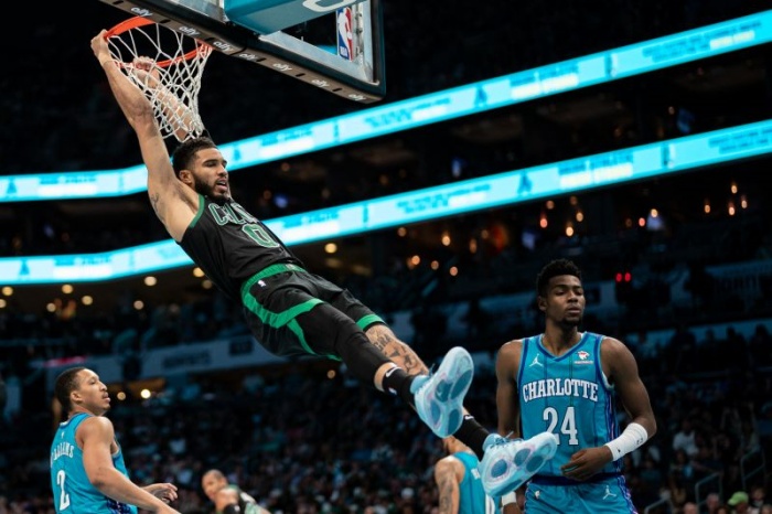 Forward Boston Celtics Jayson Tatum melepaskan dunk pada kuarter ketiga laga NBA antara Charlotte Hornets dan Celtics di Spectrum Center, Charlotte, North Carolina. (Getty Images)
