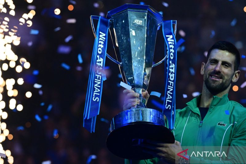 Ilustrasi: Petenis Serbia Novak Djokovic merayakan keberhasilannya memenangi pertandingan puncak ATP Finals yang berlangsung di Turin, Italia, Minggu (19/11/2023). (AFP)