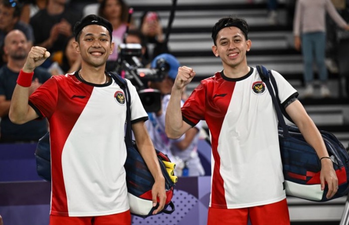 Ganda putra Indonesia Fajar Alfian (kiri) dan Muhammad Rian Ardianto berpose usai bertanding lawan ganda putra Prancis Lucas Corvee/ Ronan Labar pada babak penyisihan Grup C Olimpiade 2024.