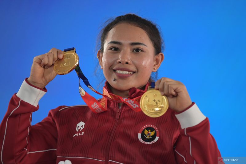 Lifter putri Indonesia Ni Nengah Widiasih berpose dengan medali emas yang diraihnya dari kelas 45 kg ASEAN Para Games 2023. (ANTARA)