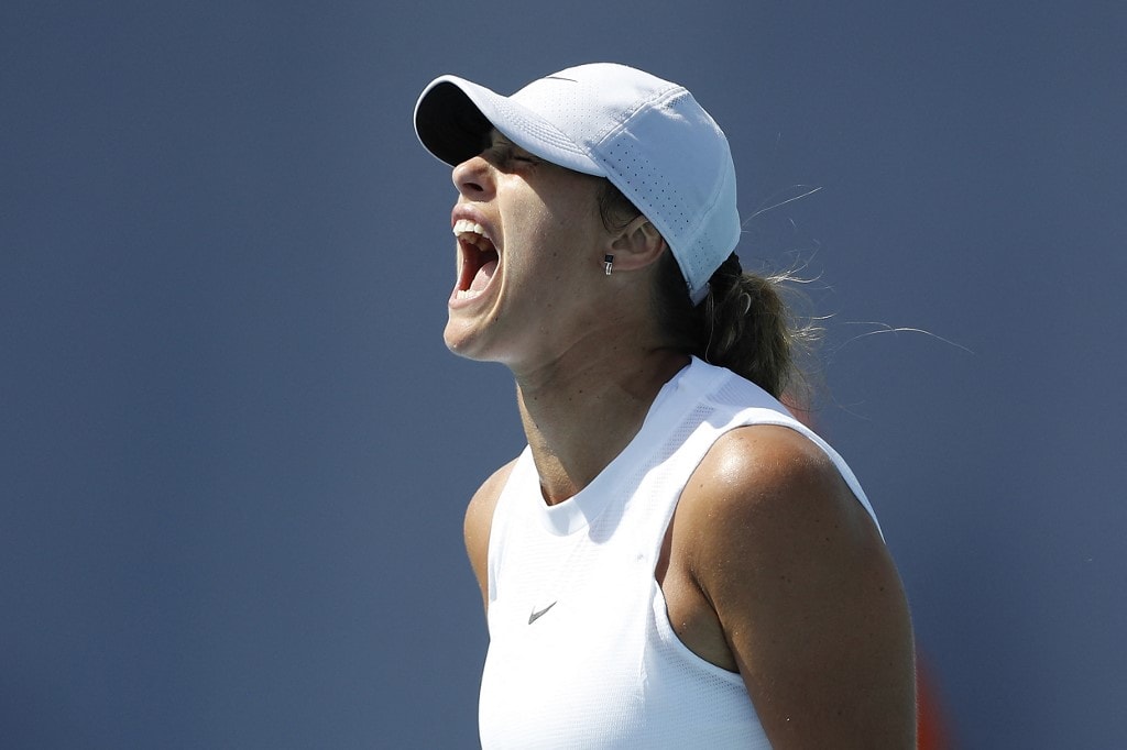 MIAMI GARDENS, FLORIDA - MARCH 30: Aryna Sabalenka of Belarus reacts in her match against Ashleigh Barty of Australia during the Miami Open at Hard Rock Stadium on March 30, 2021 in Miami Gardens, Florida. Michael Reaves/Getty Images/AFP (Photo by Micha