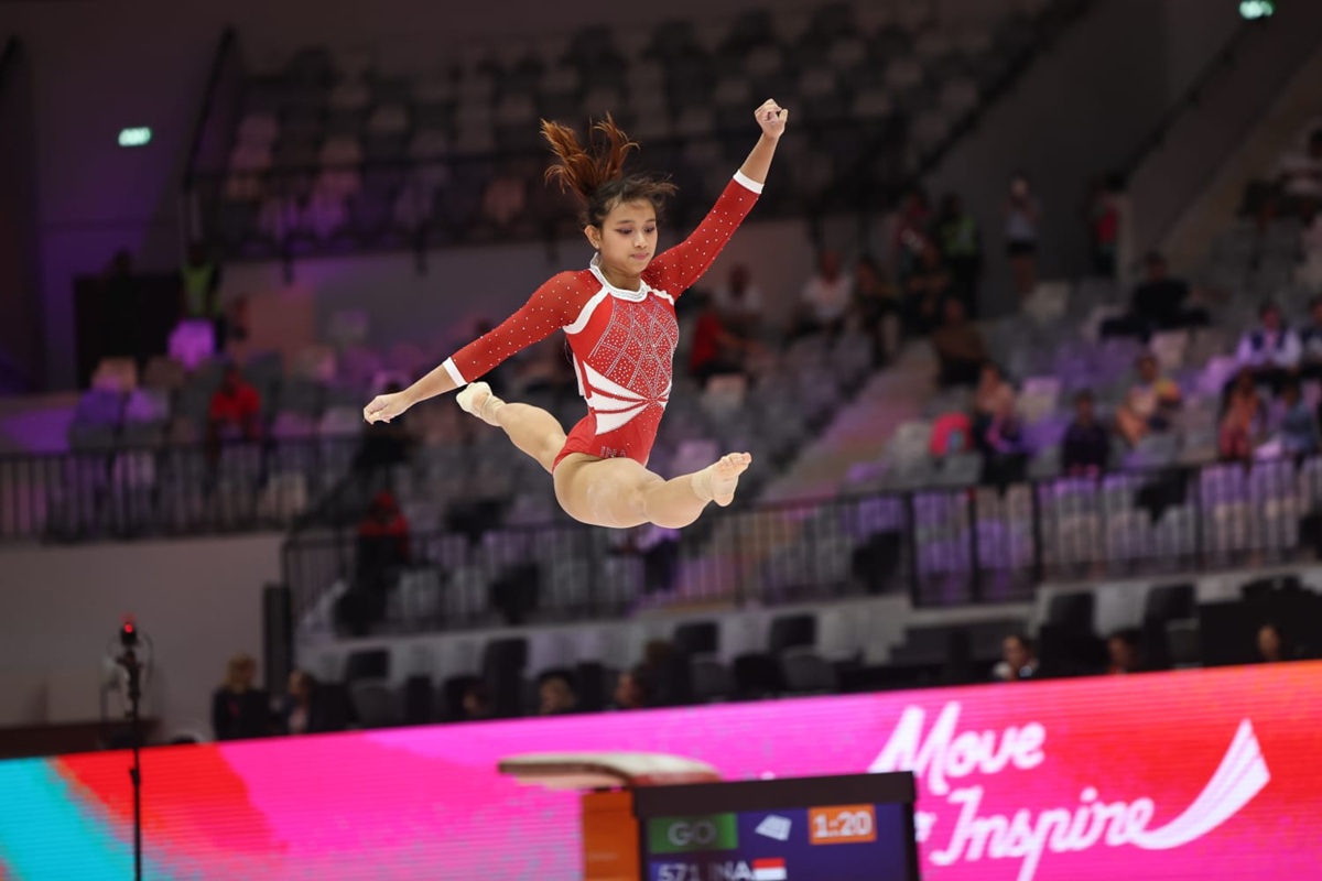 Atlet senam artistik muda Indonesia, Alarice Mallica mencatatkan debut di Kejuaraan Dunia Senam Artistik 2025 dengan turun di semua nomor/alat. (Dok: Jakarta Gymnastic OC)