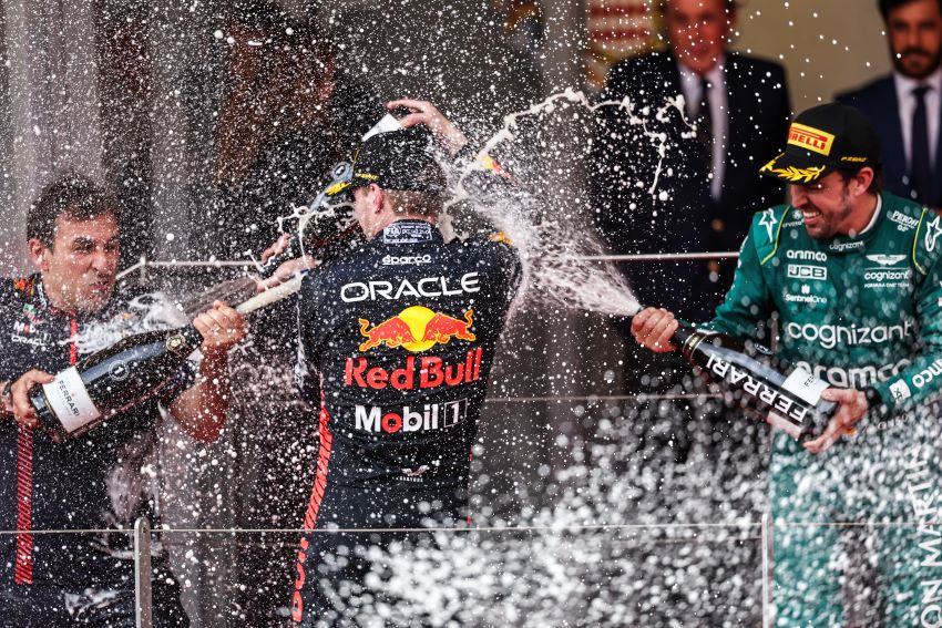 Max Verstappen (tengah) dan Fernando Alonso (kanan) menyemprotkan sampanye di atas podium Sirkuit Monte Carlo, usai memenangi Formula 1 GP Monako.