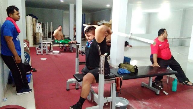 LATIHAN: Sejumlah atlet angkat berat NPC tengah berlatih di tempat latihan, Senin (29/1)