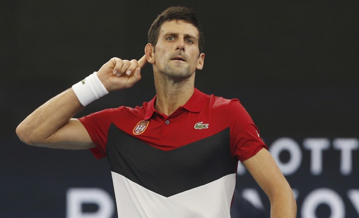 Novak Djokovic of Serbia gestures to the crowd against Denis Shapovalov of Canada during their ATP Cup tennis match in Sydney, Friday, Jan. 10, 2020. (AP Photo/Steve Christo)