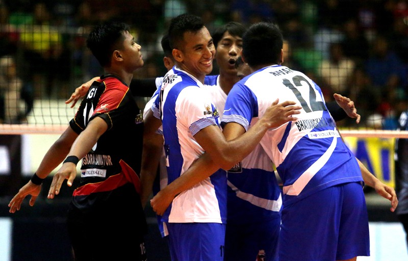 Para Pebola voli putra Surabaya Bhayangkara Samator seleberasi saat melawan tim putra Lamongan sadang MHS pada pertandingan putaran pertama Bola Voli Proliga 2020 di Gelanggang Remaja Pekanbaru, Riau, Minggu (26/1/2020). HARITSAH ALMUDATSIR/JAWA POS