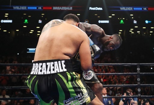 NEW YORK, NEW YORK - MAY 18: Deontay Wilder knocks out Dominic Breazeale in the first round during their bout for Wilder