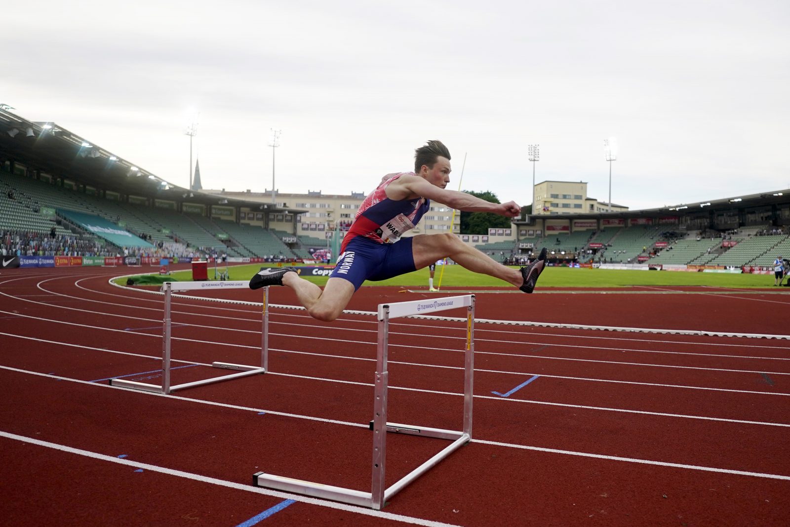 Cornelius Poppe/NTB Scanpix/AFP TUAN RUMAH: Karsten Warholm saat tampil di nomor 300 meter lari gawang.