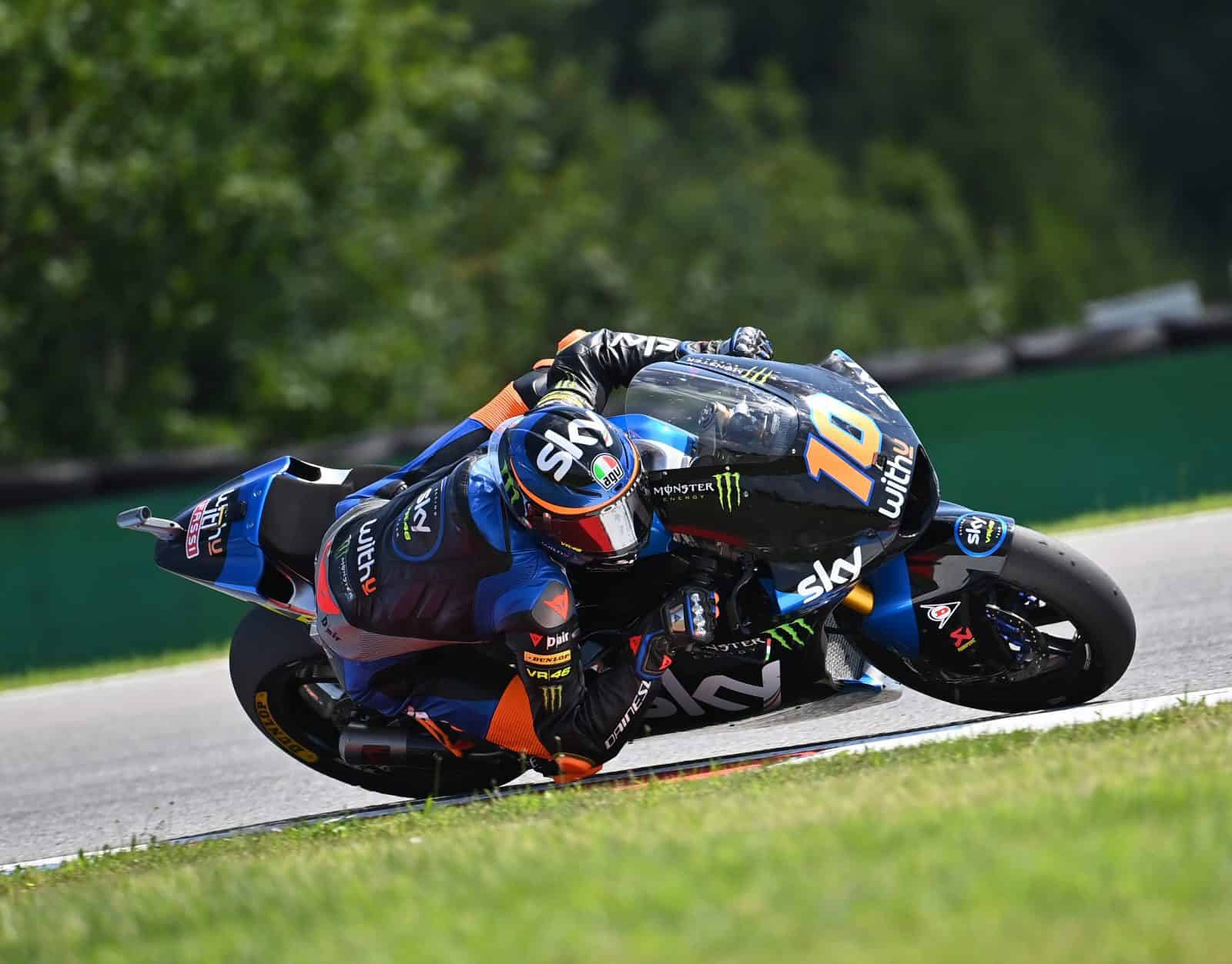 POTENSIAL: Pembalap Sky Racing Team VR46 Luca Marini melalap tikungan di sirkuit Masaryk, Brno (9/8). JOE KLAMAR/AFP PHOTO