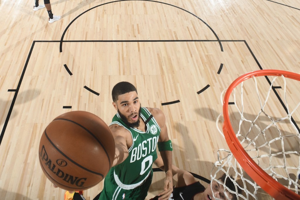 ORLANDO, FL - SEPTEMBER 19: Jayson Tatum #0 of the Boston Celtics shoots the ball against the Miami Heat during Game Three of the Eastern Conference Finals of the NBA Playoffs on September 19, 2020 at AdventHealth Arena in Orlando, Florida. NOTE TO USER: