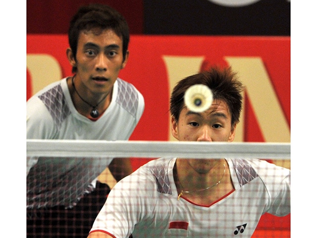MANTAN PELATNAS: Agripinna Putra (kiri) saat berpasangan dengan Markus Fernaldi Gideon di ajang Indonesia Open 2012. (BAY ISMOYO/AFP)