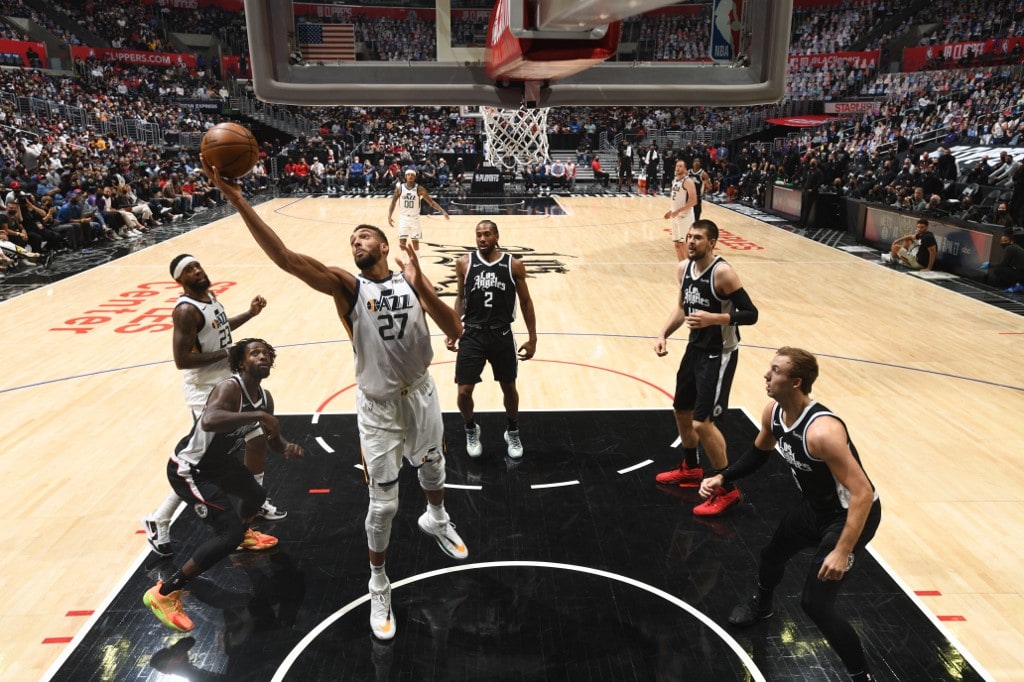 LOS ANGELES, CA - JUNE 12: Rudy Gobert #27 of the Utah Jazz rebounds the ball during Round 2, Game 3 of the 2021 NBA Playoffs on June 12, 2021 at STAPLES Center in Los Angeles, California. NOTE TO USER: User expressly acknowledges and agrees that, by down