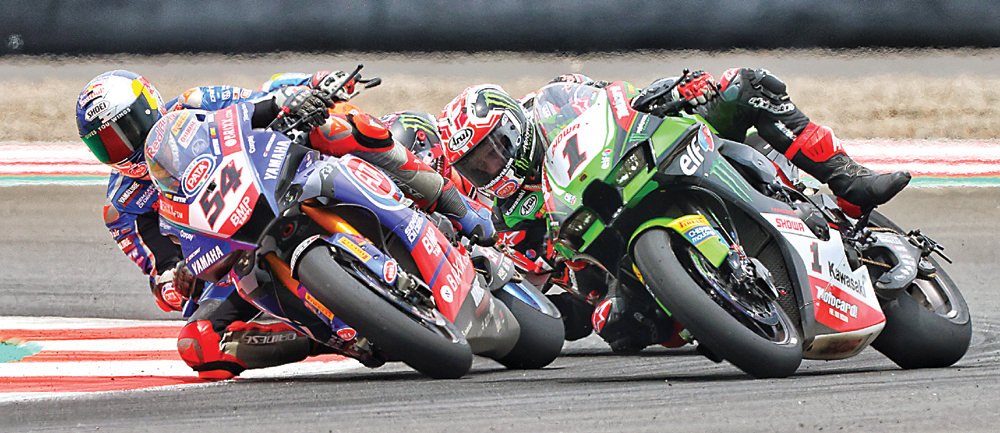 BERSAING KETAT: Toprak Razgatlioglu (kiri/nomor 54) menempel ketat Jonathan Rea (nomor 1) pada seri terakhir WSBK di Sirkuit Mandalika, Lombok Tengah, kemarin (21/11). (IVAN/LOMBOK POST)
