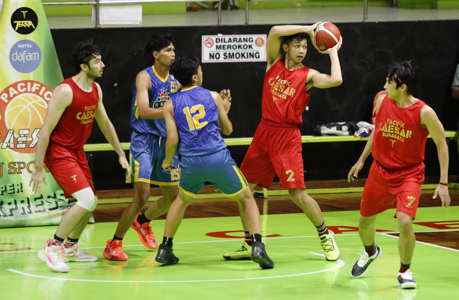 TAK GANGGU PERSIAPAN: Tim Pacific Caesar (kostum merah) melakukan uji coba melawan tim Human Basketball di GOR Pacific Caesar, Surabaya, kemarin (30/12). ANGGER BONDAN/JAWA POS