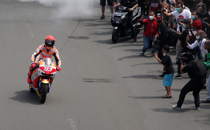 Pembalap Repsol Honda Team MotoGP Marc Marquez dengan motornya saat mengikuti parade dengan rute Istana Merdeka - MH Thamrin, Jakarta, Rabu (16/3/2022). Parade tersebut merupakan bentuk apresiasi atas kerja keras Pemerintah dalam mempersiapkan pagelaran M