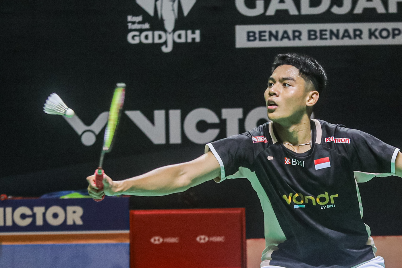 Pebulu tangkis tunggal putra Indonesia M. Zaki Ubaidillah mengembalikan kok ke arah pebulu tangkis Singapura Loh Kean Yew pada babak 16 besar tunggal putra Daihatsu Indonesia Masters 2026 di Istora Senayan, Jakarta, Kamis (22/1/2026). (Salman Toyibi/Jawa Pos)