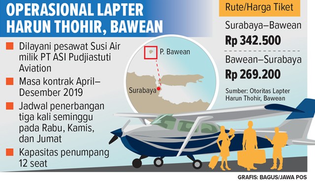 JawaPos.com - Lapangan Terbang (Lapter) Harun Thohir, Bawean, kini dilayani maskapai baru. Yaitu, PT ASI Pudjiastuti Aviation yang mengoperasikan pesawat Susi Air. Tujuannya, Surabaya–Bawean dan sebaliknya. Kapasitas penumpangnya 12 seat (kursi) dengan dua kru. ’’Frekuensi penerbangan tiga kali seminggu,” kata otoritas Lapter Harun Thohir Jupri kemarin (21/6).