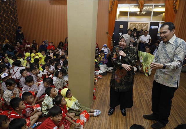 JawaPos.com - Di hadapan ratusan siswa, Wali Kota Surabaya Tri Rismaharini menjadi pendongeng. Bersama Wakil Ketua KPK Saut Situmorang, Risma membacakan dongeng berjudul Si Empunya Telur yang mengandung prinsip-prinsip antikorupsi. Pembacaan dongeng itu menjadi rangkaian road show bus KPK 2019 bertajuk Jelajah Negeri Bangun Antikorupsi di gedung Siola, Surabaya, kemarin (13/7).