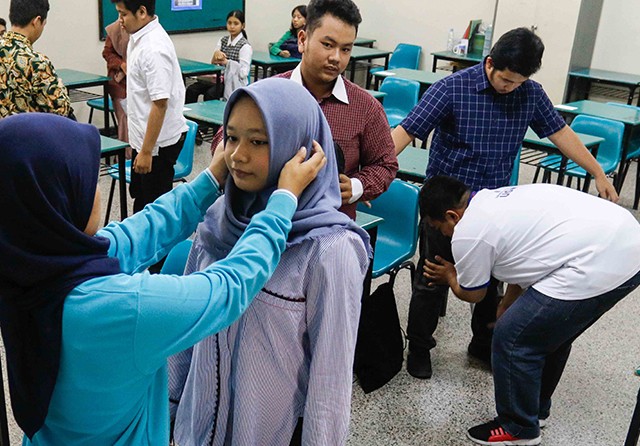 ANTISIPASI JOKI: Petugas memeriksa tubuh para peserta ujian tulis jalur mandiri UGM di SMA Al HIkmah kemarin. (Alfian Rizal/Jawa Pos)