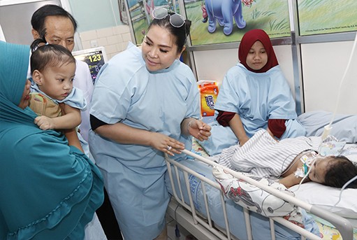 SEMOGA CEPAT PULIH: Istri gubernur Sulawesi Tenggara Agista Ariyani (dua dari kanan) kemarin membesuk kembar siam Akila-Azila yang telah dipisahkan tim PPKST RSUD dr Soetomo. (Alfian Rizal/Jawa Pos)