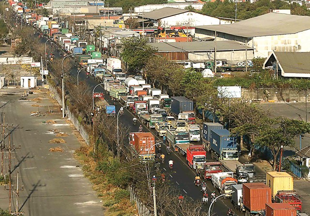TAK TERURAI: Antrean truk di Jalan Greges–Kalianak kemarin (9/9). (Alfian Rizal/Jawa Pos)