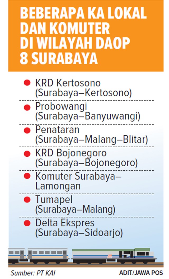 Saat ini tempat pemberangkatan dan pemberhentian KA lokal serta KA komuter di wilayah Daop 8 Surabaya memang berpencar. Sebagian penumpang naik atau turun di Stasiun Surabaya Kota. Lainnya masuk melalui Stasiun Pasar Turi dan Gubeng.