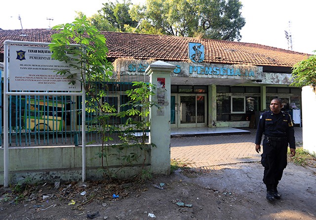 JADI REBUTAN: Petugas linmas melintas di depan Wisma Persebaya. Bangunan tersebut kini menjadi objek sengketa hukum. (Robertus Risky/Jawa Pos)
